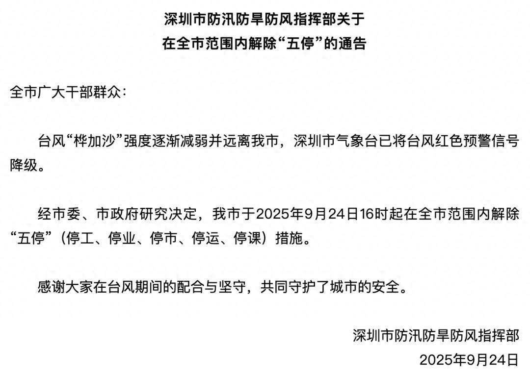 9月24日下午,深圳应急管理发布《深圳市防汛防旱防风指挥部关于在全市范围内解除“五停”的通告》股票配资注册,通告中称,深圳将于2025年9月24日16时起在全市范围内解除“五停”(停工、停业、停市、停运、停课)措施。